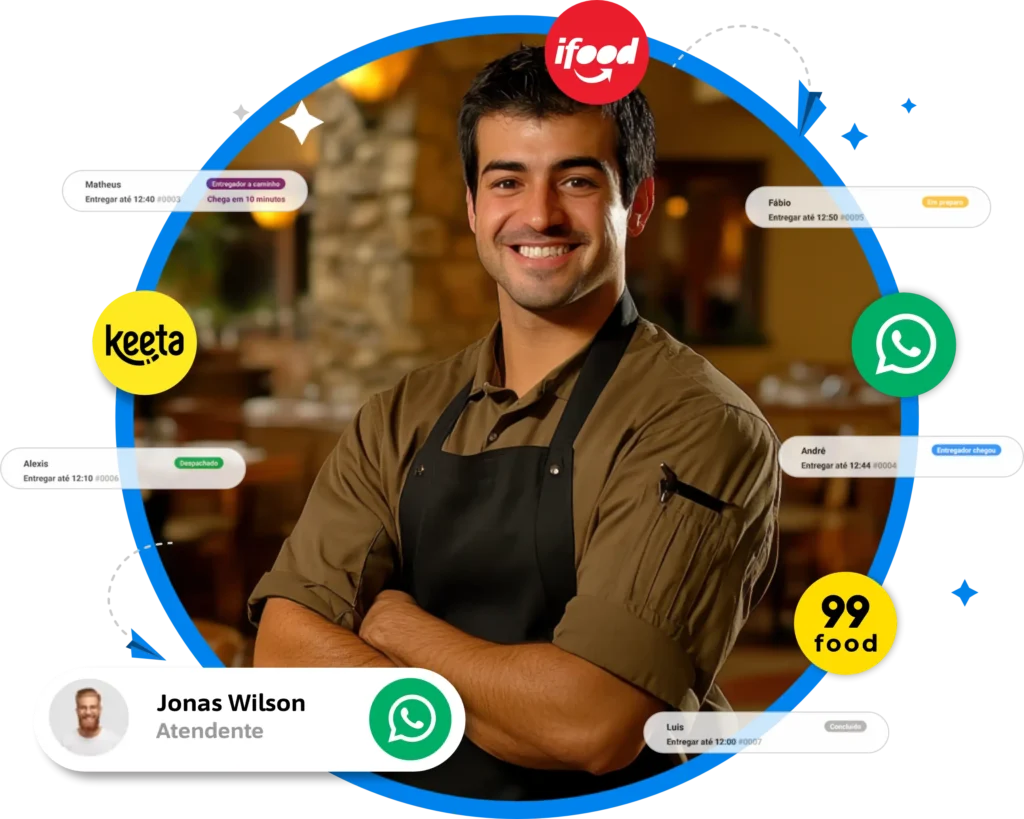 - Centralização de pedidos: iFood, 99, Keeta e WhatsApp juntos.